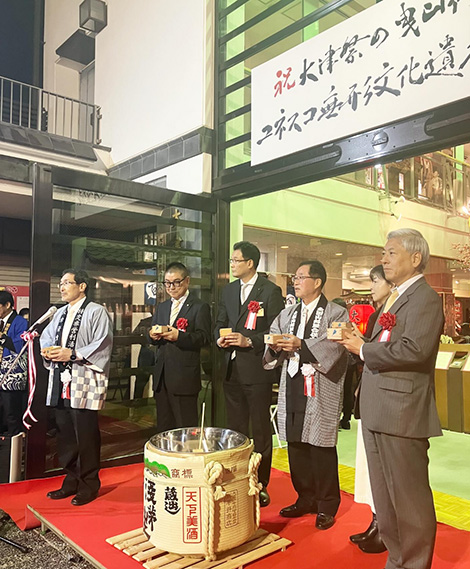 18時からは曳山展示館前で記念セレモニーを開催し、追加登録を祝う看板の除幕式や鏡開きを執り行いました。 冒頭、大津祭保存会の古家弘巳会長は「世界の祭への飛躍」と題し、「我々は何よりも伝統を守っていくことが大切。先人たちの知恵と財、努力で作られた文化財を守り、伝承伝達をし続ける所存です。大津から滋賀へ、日本から世界へと、この文化財を誇りを持って後世に継承し広めていく」と挨拶を行いました。